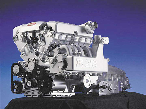 حق دارید باور نکنید که خودرویی با موتور فوق وجود داشته باشد. اما پیش از آن باید بدانید که ارتش ایتالیا در سال ۱۹۲۴ روی یکی از هواپیماهای خود چنین موتوری نصب کرده بود. حتی تیم فرمول یک فراری در سال ۱۹۶۷ نیز یک بار قصد طراحی موتوری با این ساختار را داشت. ولی هرگز روی خودرویی نصب نشد. گل پیروزی را کمپانی بوگاتی در سال ۱۹۹۸ زد. این شرکت با معرفی مدل EB218 اولین خودروی واقعی که قوای محرکهاش یک موتور W18 بود را معرفی کرد. گفته میشود خودروی فوق قدرتی معادل ۵۵۵ اسببخار داشت.